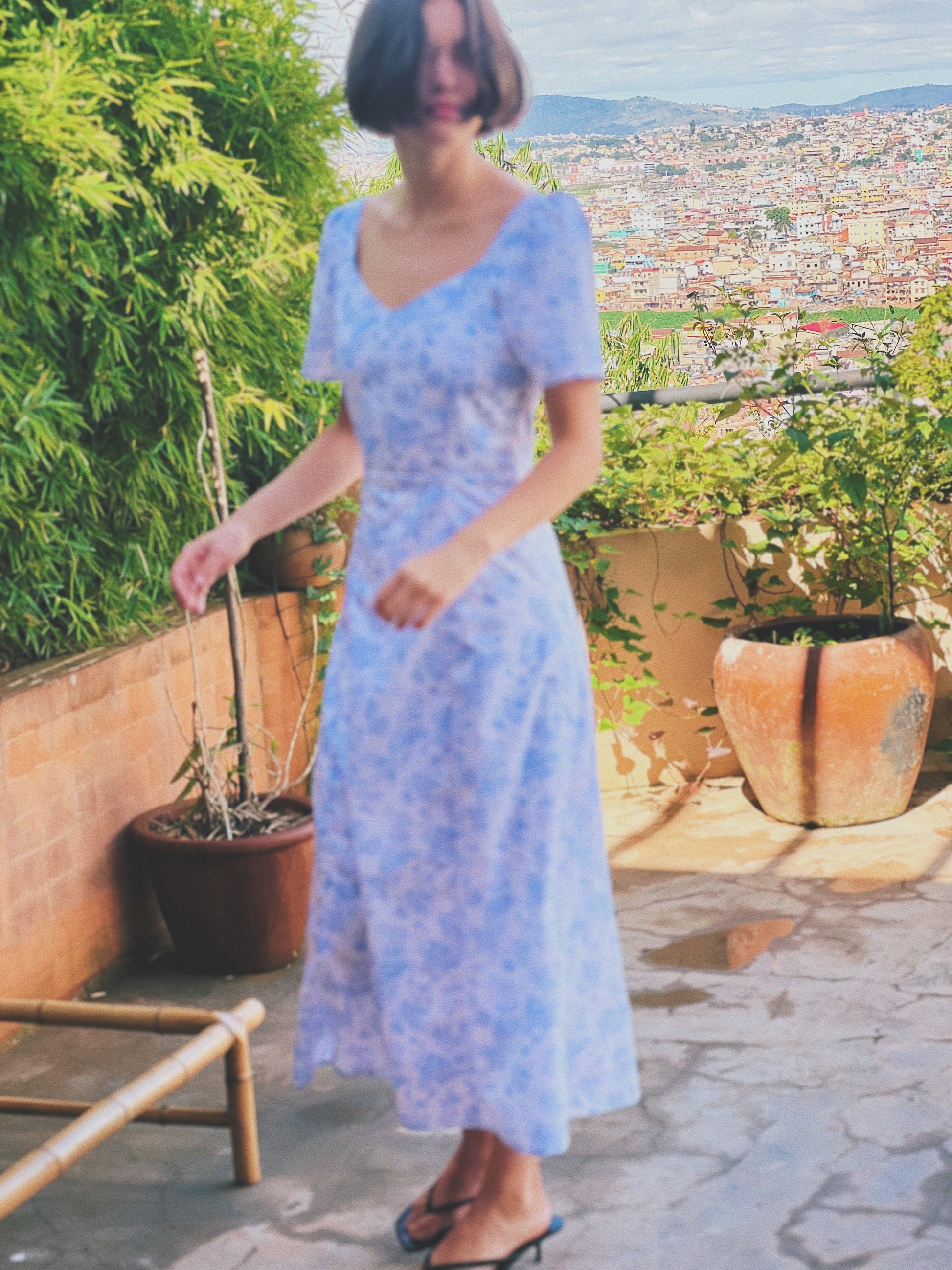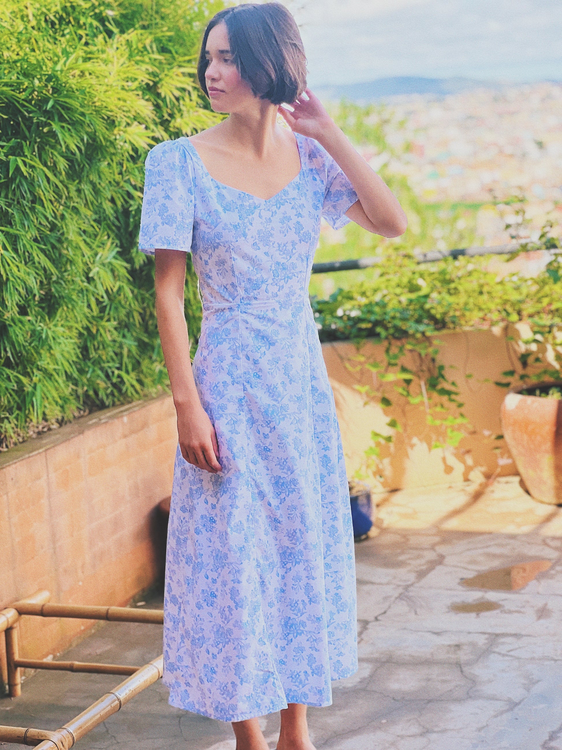 Weißes Kleid mit blauem floralem Print.