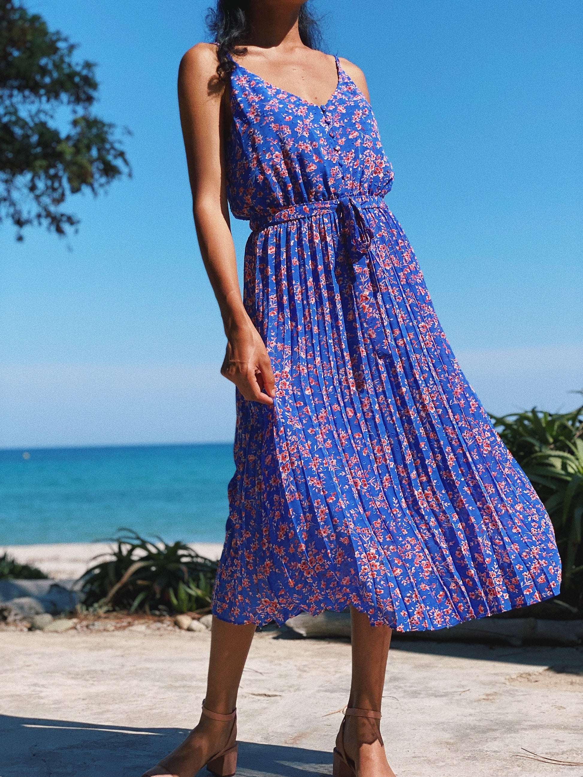 Blaues plissiertes Kleid mit rotem floralem Print