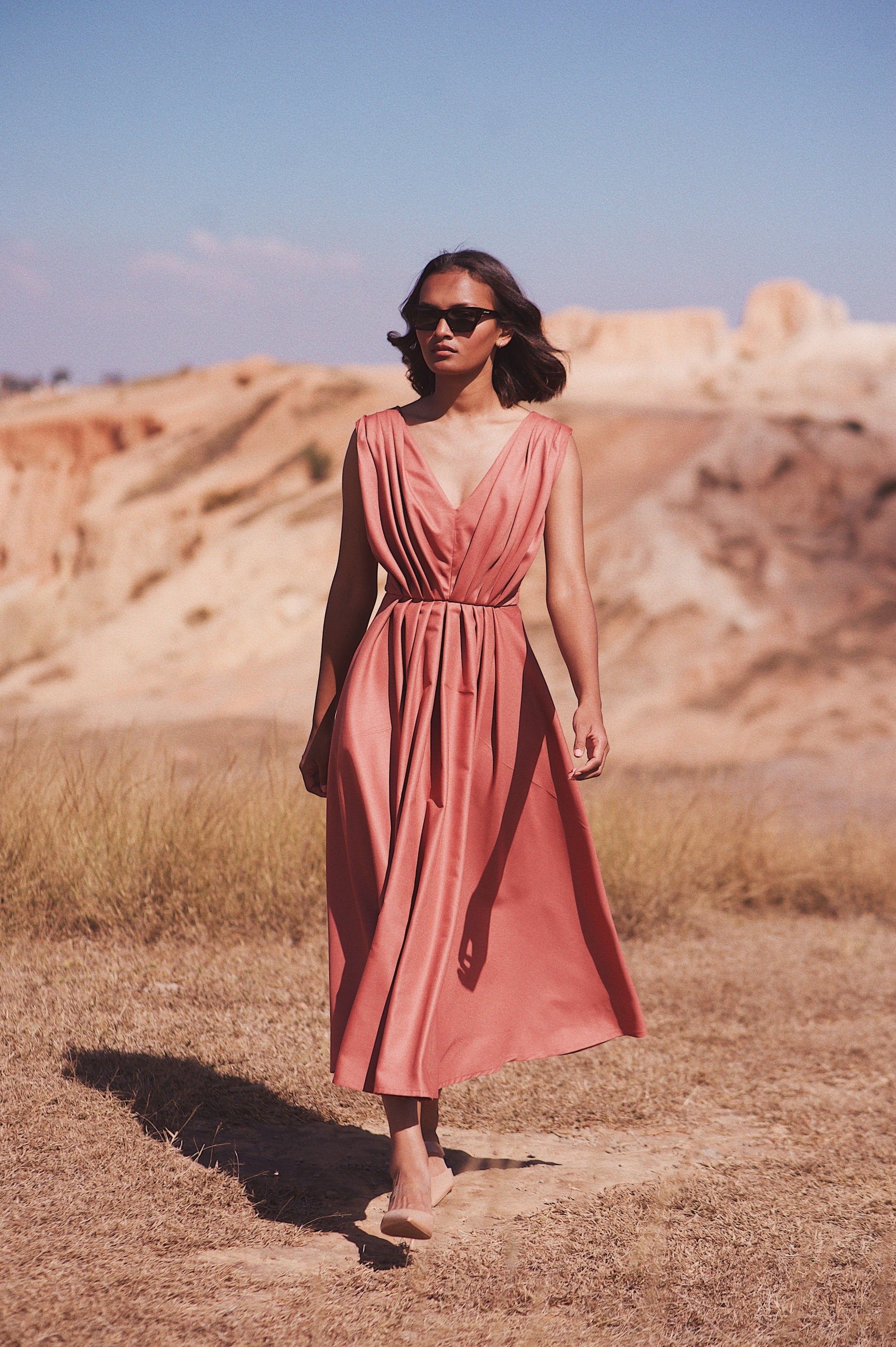 Its midi length and V-neckline, enhanced by soft draping at the bust, create a feminine and fluid silhouette.
