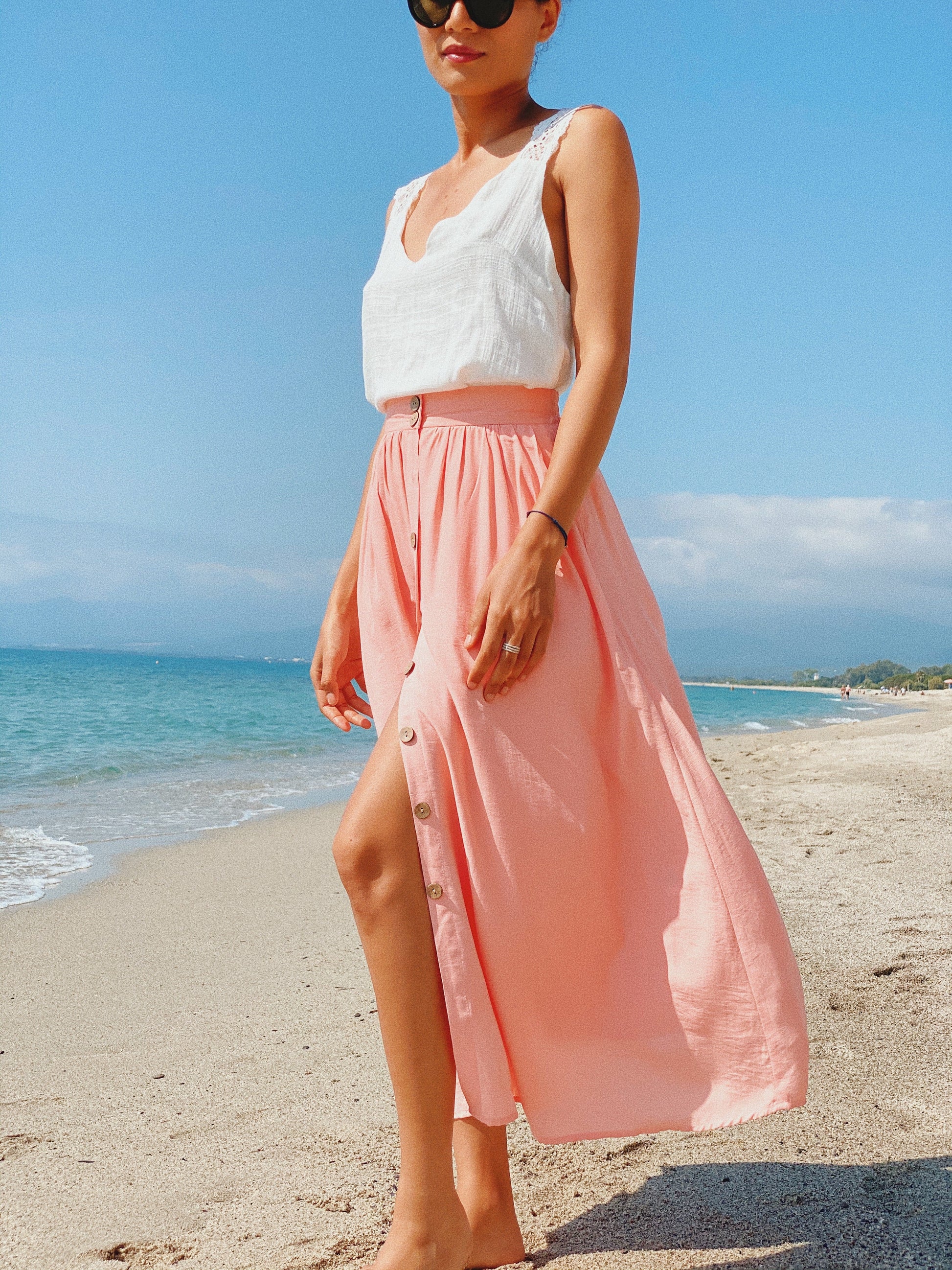 High-waisted pink skirt, designed for a feminine and elegant silhouette.